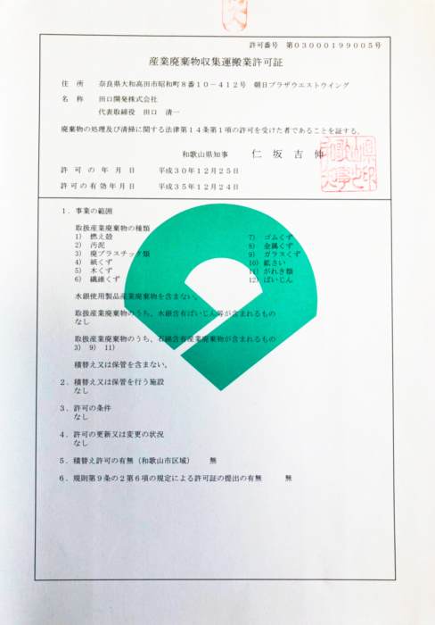 弊社は奈良県と大阪府にて、産業廃棄物収集運搬業許可証を取得しています。